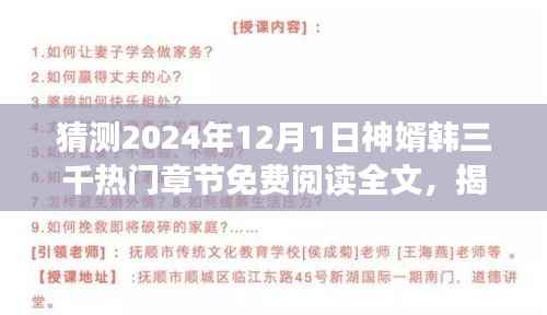 随着网络文学的发展,热门小说不断涌现,神婿韩三千》以其独特的魅力吸引了众多读者的关注,对于热爱这部作品的粉丝来说,猜测最新章节的内容总是令人兴奋不已,本文将围绕“猜测2024年12月1日《神婿韩三千》热门章节免费阅读全文”这一主题,带您一探究竟,为您呈现一场精彩的文学盛宴。
